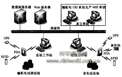 該系統由采集終端(GPS接收器、RFID和條碼閱讀器)、移動終端(PDA類掌上電腦)、巡檢工作站、WEB發布服務器和數據庫服務器組成如圖4。方便靈活的插件式設計可以和第三方系統如輸配電GIS系統和生產MIS系統進行對接,使電力企業的信息平臺做到最大化的信息共享和應用。