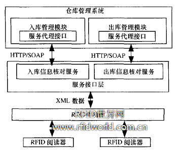 利用SOA 松耦合、面向業務的特點,本文設計了基于SOA的架構,利用Web Service技術實現RFID中間件與企業系統的集成,完成兩者的松耦合集成。系統結構設計如圖2所示。
