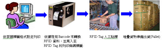 由產品資料庫中依所要出貨的通知單號經由標簽列印管制系統自動編號產生唯一RFID正/側麥頭標簽,本計劃RFID印表機則是采用Zebra R110Xi,套用一般紙箱最常使用的4*6吋Alien 9540 Tag,由于RFID要取代原正/側麥頭標簽,因此須在4*6吋Alien 9540 Tag中間再切一刀,原構想只是請工廠加工切怎樣一刀不須花多少錢,等廠商報價竟須花一筆上萬不小的開模費,要不是合作廠商鼎力到處拜托尋找,不然在數量不多情況下勢必得花一筆錢定制。圖2為標簽列印與人工貼標。
