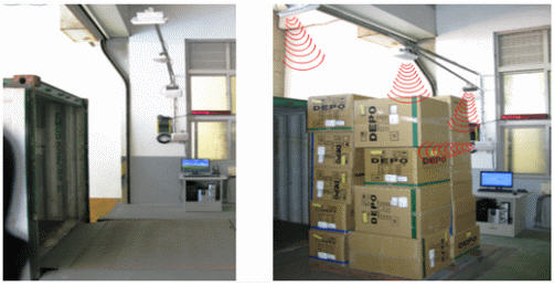 將貨柜到達北美收貨倉時,首先透過PDA讀取貨柜電子封條確保其完整性,并將資訊傳回至后端系統以利追蹤。透過RFID進貨清點系統和選擇柜號編號,從后端擷取相關出貨資訊,并和貨物經由輸送帶進入RFID讀取區所讀取進貨麥頭標簽進行比對與統計,最后可產生進貨差異分析表。本計劃在北美只作進貨驗測,且平日作業即以輸送帶進行貨品傳遞,因此我們采用機動式的架勢方式,利用一臺Alien 9800和二支Linear天線架設于輸送帶二側,并避開相互干擾,以利進行RFID麥頭標簽的讀取。