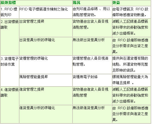 在完成RFID成品出貨管理及貨柜追蹤系統導入測評后與現有作業狀況作的績效指標評估,如下表: