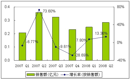 圖2 2007 Q1-2008 Q2年中國社保卡市場規模與增長(按銷售額)