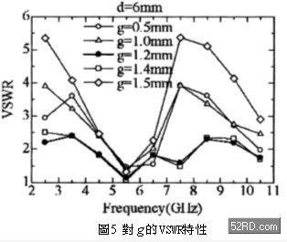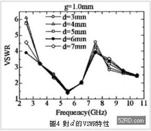 小型橢圓狀原件的高度則為0.16Wz,圖2中對阻抗整合特性最具影響的參數分別是兩橢圓狀原件的間隔「d」,與橢圓狀原件-倒U字型原件之間的間隙「g」,本天線的實際尺寸利用實驗性檢討找出概略值,接著再透過模擬分析作最佳化設計。