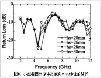 天線電路基板化時選擇印刷電路板方式,由于本UWB天線上限頻率為11GHz,因此採用即使上限頻率損失仍然很低的鐵氟龍(Teflon)材質基板,實際上基板厚暫定為0.8mm,比誘電率εr=2.6,接著利用Moment法以IE3D模擬軟體進行尺寸最佳化設計,圖10是針對小型橢圓狀原件高度hs進行模擬分析獲得的VSWR特性,如圖10所示小型橢圓狀原件的高度28mm,頻率2GHz時VSWR最小,接著依此決定各部位最佳化尺寸。
