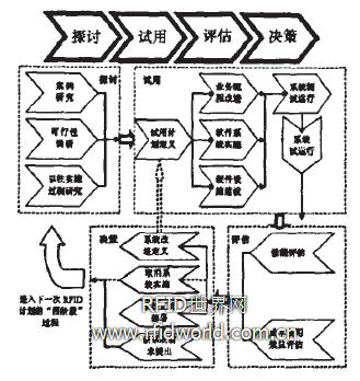 “多階段實施”策略是指在零售企業每一次針對特定范圍(如托盤電子標簽化)的RFID計劃執行過程中需要明確劃分負責不同內容的實施階段。一般分為“探討”、“試用”、。評估”及“決策”等四階段,如圖3所示。