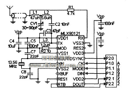 發射電路中的L3、C3組成并聯諧振網絡,諧振頻率為13.56MHz,對MLX90121產生的射頻讀寫命令信號起到選頻濾波的作用。L3為高頻扼流圈,C3為47pF的高頻耦合瓷片電容,用于隔離漏極Lc回路的直流電壓并傳遞交流能量到下一級電路。C3的選擇應足夠大以保護芯片,但需保證L3C3諧振丁13.56MHz。R2為調制度調節電阻,其阻值直接影響到發射輸出射頻信號的調制深度,這里選用10Q電阻。C7、C8、13.5BMHz晶體諧振器和芯片內部電路構成晶體振蕩器。XBUF引腳輸出13.56MHz或其2分頻后的信號,可供單片機作時鐘信號。