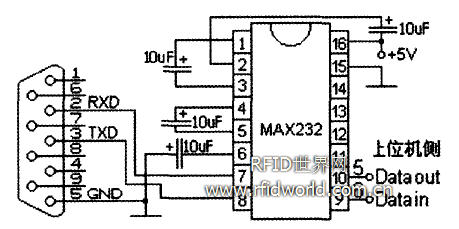 AT89S52 單片機除了控制MLX90121芯片工作外,還擔負著與控制中心通信的任務,可采用RS232通信標準來實現讀寫器和控制中心上位機問的通信。通信芯片選用MAXIM公司的MAX232芯片,硬件上采用三線制(RXD,TXD,GND)軟握手的零MODEM方式i將上位機和AT89S52單片機的發送數據線(TXD)和接收數據線(RXD)交叉連接,并共地線。這樣的設計可以簡化電路設計,節約成本。MAX232與AT89S52的電路連接如圖5所示。AT89S52的其它電路(如時鐘電路、復位電路)可選經典電路。