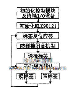 系統工作的軟件流程如圖6所示。首先需要對控制模塊、終端I/O設備及射頻模塊進行初始化,預置參數和顯示初始信息。然后發送讀標簽命令,建立讀寫器和電子標簽的通信。電子標簽FM11RF08的通訊協議和通訊波特率是預定義好的,通過這兩項內容,讀寫器和標簽相互驗證。當某張標簽進入讀寫器的操作范圍時,讀寫器以特定的協議與它通訊,從而確定該標簽是否為FM1IRF08。當有多張FM11RF08標簽進入讀寫器操作范圍時,防沖突閉合電路首先從眾多標簽中選擇一張作為下一步處理的對象,而未選中的標簽則處于空閑模式以等待下一步被選擇,該過程將返回一個被選中標簽的序列號。選定要處理的標簽之后,讀寫器就確定要訪問的扇區號,并對該扇區密碼進行校驗,在三次互相認證之后就可以通過加密流進行讀/寫標簽操作。