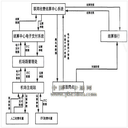 機場高速公路主線收費站ETC車道系統將ETC收費數據發送至收費站ETC系統數據庫中,由站端ETC收費系統生成統計數據,并將ETC統計數據和ETC收費數據上傳至聯網收費結算中心電子支付系統中;由聯網收費結算中心的電子支付系統負責ETc收費數據的統計、校驗和匯總,并與銀行進行數據交換,完成資金劃撥。聯網收費結算中心沿用電子支付系統結算方式,負責統計ETC通行費,提交給銀行進行結算,以及通行費拆賬。