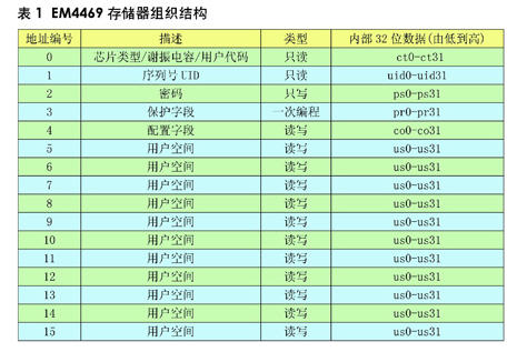 512位的EEPROM存儲空間,被分成16個扇區(編號為0-15),每個扇區有32位(編號為0-31),讀寫時按低位優先的原則進行,總是從LSB開始。其中第0和第1扇區由芯片生產廠商定義為只讀扇區,芯片的類型、版本、用戶代碼和唯一序列號(UID)都寫在這兩個扇區中;第2,3,4三個扇區是內部管理塊,用來定義器件的操作選項(輔助管理字段),它們由密碼塊、保護字塊和配置字塊組成;剩下的11個扇區(5-15)是用戶可以自由使用的空間(共352位)。EM4469的存儲器結構如表1所示。