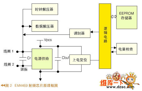 射頻電子標簽通過射頻電路檢測到便攜式手持讀寫器發出的信號后進行解調,再把有效信息傳輸給標簽內的單片機;而便攜式手持讀寫器接收數據信息的過程剛好與發送時相反,即射頻電子標簽要對發送的信號進行調制,便攜式手持讀寫器則對其進行解調,再把有效信息傳輸給便攜式手持讀寫器內部的單片機。以上工作主要由射頻芯片實現,本設計采用EM4469芯片。