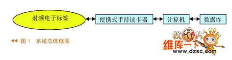 基于RFID技術的動物識別和跟蹤管理系統主要由射頻電子標簽、便攜式手持讀寫器以及計算機網絡及數據庫管理軟件組成。系統組成如圖1所示。