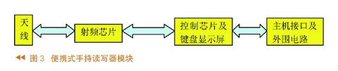本系統的便攜式手持讀寫器體積小,攜帶方便,可以由管理人員帶到動物身邊讀寫耳標,主要由天線、射頻部分、控制部分以及主機接口四大模塊組成。此外,為了方便用戶使用,用來顯示和輸入數據的液晶顯示屏和鍵盤也是不可缺少的。設計原理框圖如圖3所示。各模塊功能介紹如下: