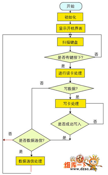 本系統的主要功能是完成便攜式手持讀寫器對電子射頻標簽的讀寫過程。首先初始化單片機串口,發送開射頻場的命令,輸入要讀取(寫入)的數據扇區的區號。然后發送讀數據(寫數據)的命令,判斷此命令是否發送完畢,若未發送完就繼續發送;若發送結束就判斷是否有數據,沒有數據則提示錯誤并返回到初始化的地方,如果有數據就開始接收(寫入)。最后判斷接收到的數據正確與否,如果正確,則可以進行數據處理;如果錯誤,則提示錯誤并返回初始化。
