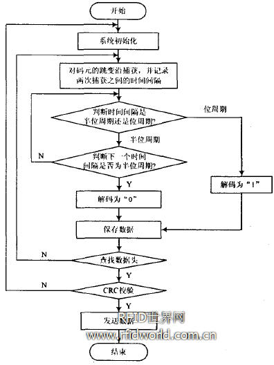 讀卡過程先對系統進行初始化,單片機ATmega88的T/C1內部有輸入捕獲單元,可應用于精確捕獲一個外部事件的發生以及事件發生的時間印記。EM4095解調輸出的波形輸入到單片機的ICP1引腳,單片機進行跳變沿捕獲,定時器捕捉中斷的觸發方式必須采用上升沿和下降沿交替進行。也就是說,在下降沿捕捉中斷處理程序中設置下次捕捉中斷的觸發方式為上升沿,在上升沿捕捉中斷處理程序中設置下次捕捉中斷的觸發方式為下降沿。算出兩次跳變的時間間隔,根據時間間隔是否在一定的容差范圍內判斷是半位周期還是位周期,判定碼元的“0”,“1”值。解碼之后去掉用來防止數據頭重復出現的尾碼,數據保存后查找ll位的數據頭,找到數據頭后對對64位ID號進行CRC校驗,校驗通過后便可獲得動物標簽ID號。4 結語