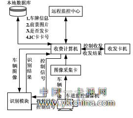 入口車道監控攝像機實時監控收費車道,當有車輛進入視頻界面時,識別模塊檢測到圖像的變化,在控制信號作用下高速抓拍車輛前景圖片,通過識別模塊進行運動圖像分割,確定車牌位置并識別車牌,識別結果回傳至收費計算機。收費計算機根據車牌信息快速檢索數據庫,如果是公務車或其它不需要繳費的特權車輛,則直接放行不進行寫卡及發卡操作。對于正常收費車輛,收費計算機控制寫卡信息并發卡,同時將發卡結果、車牌信息、車輛前景圖片及發卡的IC卡卡號存儲入正常車輛數據庫。寫入本地數據庫的信息同步上傳至遠處監控中心服務器。系統結構圖如下: