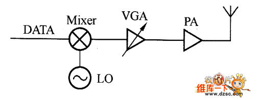 圖1是用于幅度調制的發射電路架構,包括本地振蕩(LO)、可變增益放大器(VGA)、功率放大器(PA)以及天線(Anta),其中LO提供了發射電路的載波頻率,輸入數據通過VGA來調制發射載波,從而產生幅度調制信號。PA則把輸出功率進行放大,然后通過天線把信號發送出去。這種發射電路的結構比較簡單,采用的硬件比較少。