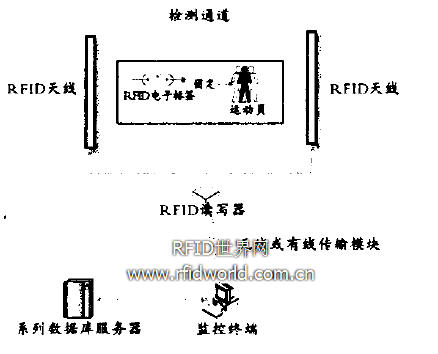 2)系統構成。系統由硬件和軟件兩部分組成。其中硬件部分包括:檢測通道、RFID 數據庫服務器 監拉終端讀寫器、傳輸模塊、監控終端、數據庫服務器和RFID標簽;軟件部分包括:后臺數據庫和應用軟件。如圖2所示。