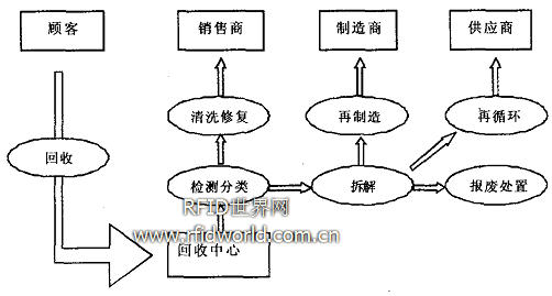 如果產品記錄信息全面,則可以在一定程度上通過信息判斷取代實體的檢測,既節約設備投資,又加快處理速度。如果產品需要維修,技術員就通過PDA(個人數字助理),對RFID標簽做上記號。當產品修復完成后,實時在標簽上記錄修復信息(如修復元件代號,替換元件代號等),同時上傳信息至數據庫。當產品生命周期結束時,回收中心將產品標簽上的信息被讀入系統,并通過互聯網查詢制造商數據庫,從而獲得再制造或翻新的模塊、產品材料信息、最終拆卸說明等信息。同時發送標簽信息,制造商將對數據庫進行更新。