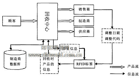 統網絡發送至制造商數據庫。當產品通過回收中心修復處理,再由銷售商二次銷售時,銷售商將調整產品RFID上的相關Et期及客戶代碼。同時向數據庫上傳信息。