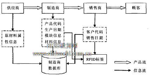 (1)RFID是通過標簽對產品信息采集和跟蹤的,當制造商完成產品的生產過程后,把與之配套的載有產品基本物理信息(包括產品代碼、生產f3期、模塊信息和材料信息)的標簽置入相應產品上,這是RFID的準備階段,同時插入標簽的產品相關信息將會被發送至制造商數據庫收集起來。