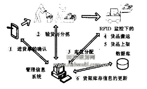 一般來說,貨品入庫業務都必須包含進貨單確認、驗貨、搬運上架、更新貨架信息等四個主要環節。傳統的管理手段在這四個方面都必須要有人工進行干預監控,尤其在后兩個方面,一旦出錯往往無法被及時糾正。而基于RFID技術的系統,對流程進行了一定程度的梳理,使后兩個環節可以達到自動監控,更新貨架信息這個環節更是無需人工參與,保證了信息的實時更新,大大提高了運營、管理的效率,其業務流程如圖3所示。
