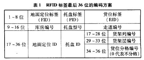 該階段主要對RFID標簽、天線以及閱讀器進行調研、選型及性能進行測試。標簽采用EPC CLASS1 GEN2標準的無源標簽,存儲容量96位(bit)。根據通用標識符(GID一96)EPC標簽數據標準進行定義 :前8位為標頭(Header),統一使用0x35(十六進制)表示。接下來28位為廠商識別代碼(GeneralManager Number):是由EPC統一分配的企業代碼,目前暫時借用VERISIGN公司提供測試的標簽代碼0xOO24ABD。緊接的24位為對象分類代碼(Object Class):目前在系統中有三種對象需要區分—— 地面定位(Floor ID)、貨位標簽(Rack ID)和托盤(PMlet ID),分別以0x000065、0xOO0066和0x000067進行表示。最后36位為序列號(SefiM Number):其中前8位自行定義為配送中心代碼(最大可用數量256),其余各位段根據定義對象的不同,進行相應的定義(如表1所示)。故當閱讀器讀到一張標簽的數據為0x35,0024ABD,000065,O1,0l,XXXXX時,就可以確認為其是一張貼于01號配送中心0l號庫房的XXXXX號地面定位標簽。