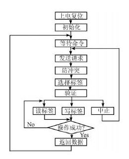 PC機通過RS232接口遠程控制讀寫器。讀寫器接到命令后,通過天線發送射頻命令實現對標簽的操作,同時接收標簽返回的數據。標簽靠其偶極子天線獲得能量,并由芯片( IC) 控制接收、發送數據。