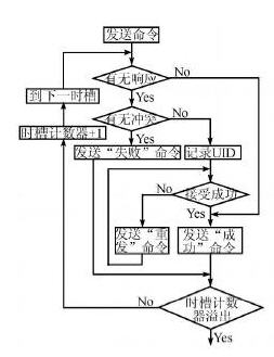 在讀寫器天線所覆蓋的范圍之內有多個標簽存在時,讀寫器發送命令后,會引起響應沖突,從而導致通信失敗。當讀寫器檢測到沖突后,可使用命令來處理存在的沖突。通過發送命令可以記錄讀寫器天線覆蓋范圍內的標簽的UID,然后利用UID的唯一性,讀寫器和各個標簽分別建立獨立的通道進行通信,從而消除沖突。讀寫器首先發送命令給標簽,在命令的數據域和參數域中分別包含UID的掩碼和掩碼的長度,傳送給標簽的掩碼要求是整字節,如果此掩碼不是整字節的話將自動在高位補零。通過設置標志域的相應標志位,讀寫器可以設置接收標簽響應的時隙為3或6,在各時隙中,讀寫器都可以接收標簽返回的UID,讀寫器通過發送結束信號的UID和當前時隙序號的最低4bit加命令數據域中的掩碼進行比較,如果不匹配則無應答,如果匹配將送回自己的UID。在某一時隙可能出現多個標簽同時做出響應,這時讀寫器要記下沖突的標簽掩碼和時隙計數器的值,以做進一步沖突處理。流程圖如圖7。