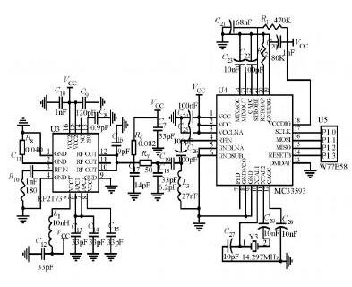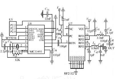 為了提高系統的接收靈敏度,本設計在天線和射頻接收/解調器之間增加了一套射頻信號放大電路,主要由RF2173組成,其功能是用于對天線接收到的射頻信號進行放大,以提高MC33593輸入射頻信號的信號強度;RF2173具有最大32dB的增益。