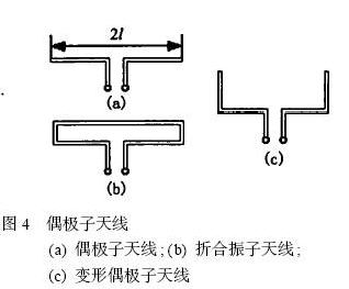 在遠距離耦合的RFID應用系統中,最常用的是偶極子天線(又稱對稱振子天線)。偶極子天線及其演化形式如圖4所示,其中偶極子天線由兩段同樣粗細和等長的直導線排成一條直線構成,信號從中間的兩個端點饋入,在偶極子的兩臂上將產生一定的電流分布,這種電流分布就在天線周圍空間激發起電磁場。利用麥克斯韋方程就可以求出其輻射場方程: