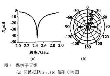 半波偶極子天線模型如圖4-a所示。天線采用銅材料(電導率:5.8e7s/m,磁導率:1),位于充滿空氣的立方體中心。在立方體外表面設定輻射吸收邊界。輸入信號由天線中心處饋入,也就是RFID芯片的所在位置。對于2.45GHz的工作頻率其半波長度約為61mm,設偶極子天線臂寬w為1mm,且無限薄,由于天線臂寬的影響,要求實際的半波偶極子天線長度為57mm。在Ansoft HFSS工具平臺上,采用有限元算法對該天線進行仿真,獲得的輸入回波損耗S11分布圖如圖5-a所示,輻射場E 面(即最大輻射方向和電場矢量所在的平面)方向圖如圖5-b所示。天線輸入阻抗約為72Ω ,電壓駐波比(VSWR)小于2.0時的阻抗帶寬為14.3% ,天線增益為1.8。