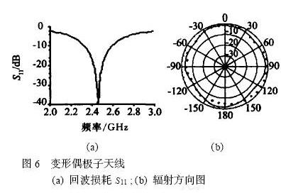 從圖5-b可以看到在天線軸方向上,天線幾乎無輻射。如果此時讀寫器處于該方向上,應答器將不會做出任何反應。為了獲得全方位輻射的天線以克服該缺點,可以對天線做適當的變形,如在將偶極子天線臂末端垂直方向上延長λ/4成圖4-C所示。這樣天線總長度修改為(57.0mm+ 2×28。5mm),天線臂寬仍然為1mm。天線臂延長λ/4后,整個天線諧振于1個波長,而非原來的半個波長。這就使得天線的輸入阻抗大大地增加,仿真計算結果約為2kΩ。其輸入回波損耗S11如圖6-a所示。圖6-b為E 面(天線平面)上的輻射場方向圖,其中實線為仿真結果,黑點為實際樣品測量數據,兩者結果較為吻合說明了該設計是正確的。從圖6-b可以看到在原來弱輻射的方向上得到了很大的改善,其輻射已經近似為全方向的了。電壓駐波比(VSWR)小于2.0時的阻抗帶寬為12.2% ,增益為1.4,對于大部分RFID應用系統,該偶極子天線可以滿足要求。