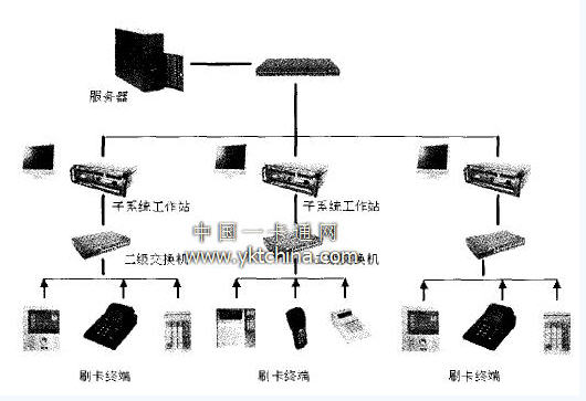 一卡通網絡系統網絡結構分為兩層 第一層是以數據庫服務器為中心的一卡通主干網.采用TCP/IP協議通訊,該層可聯接各個子系統的工作站、前置機圈存機及多媒體查詢機。第二層是由各子系統工作站控制的RS232或RS485通訊網絡,該層網絡使用工控PC機做為工作站通過485通訊卡或通過二級交換機實時控制各個終端機運行,采集交易記錄并上報至一卡通服務器。