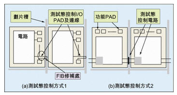 圖5a是在接觸式智慧卡晶片的發展過程中曾大量采用的測試態控制方式:使用額外的I/O接腳和晶片內部電路相連,該連線經過劃片槽,這樣晶片劃斷后就不能透過簡單控制該接腳進入測試態。由于FIB修補技術的出現,這個方法已經過時。圖5b是最有潛力的替代方案:在劃片槽和鄰近的晶片中設計部份控制電路,因而得到不可逆的測試態控制方法。