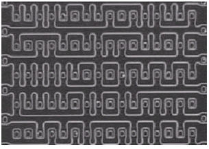 版圖重構的技術也適用于獲得唯讀型ROM的內容。 ROM的位模式儲存在擴散層,用氫氟酸(HF)去除晶片各覆蓋層后,根據擴散層的邊緣就很容易辨認出ROM的內容(圖3)。