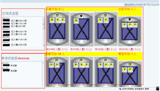 當歲修開始進行時,所有作業人員皆被強制配戴手腕型RFID Tag,作業平臺上的Reader即可接收到每一Tag的訊號,透過電腦進行控管就可知道目前有哪些人員在作業平臺上。入槽人員穿防護衣及戴氧氣面罩進入槽內工作時,電腦就可顯示何人何時進入槽內,并以動態圖顯示出人數。此外,作業人員入槽需配戴氧氣面罩,確保氧氣之不間斷供給甚為重要,所以缺氧主管一但離開離開其作業區域,電腦即會馬上顯示異常訊息警告并進行紀錄。由于入槽人員工作模式為使用工具清除槽內殘留物,手腕仍不停的擺動。一但作業人員一段時間內靜止沒有活動,電腦即會緊急警報重大異常,此時極有可能是發生如昏倒意外等,即可馬上進行緊急救護處理。