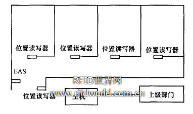 管理系統的硬件主要包括EAS電子物品監控系統(electronic article surveillance)、位置讀寫器、便攜式讀寫器等,其系統的整體方案結構如圖1所示。其中主機安裝了管理軟件,并與所有的位置讀寫器連接并對它們進行讀寫控制,如讀取記錄、統計查詢等。電子標簽存儲設備的名稱、廠家、型號、生產日期、產品標號等信息。