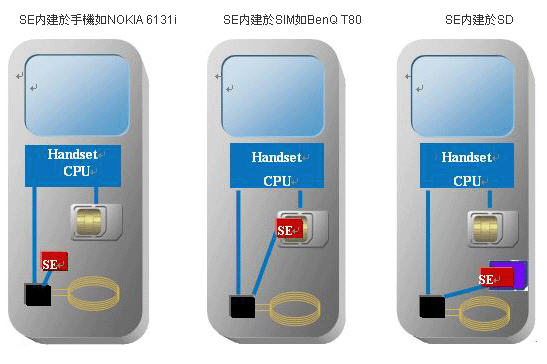 然而NFC手機發展迄今,關鍵性安全元件最常被設計之架構,分別有內建于手機內、與SIM卡結合、或置于SD卡內,其配置方式如下圖1之示意圖,然國內民眾購買手機習慣多采搭配電信業者優惠方案為主要趨勢,故關鍵性安全元件與SIM卡整合,電信業者會有較高度的愿意投資,并促成NFC之發展,達到業者、行動業者、與消費者三贏的局面。