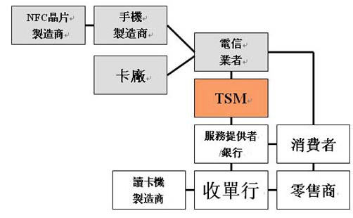 于“行動悠游Easy-Mo”計劃結束后,隨即進行悠游手機之商轉計劃,與遠雄建設以未來科技為概念之住宅共推約6000支NFC手機,除悠游卡公司之外、國泰世華銀行亦加入提供手機信用卡服務。惟搭載有安全元件、由中華電信所發行之SIM卡,必須與國泰世華信用卡、悠游卡三家服務性質迥異的發卡業者進行發卡作業之整合,因此面臨了相當多卡片生命周期(Card Life Cycle )中對于卡片管理執行方式之挑戰,此時世界各地之NFC試辦,均面臨相同問題,故國際組織GSMA(GSM Association)便定義TSM機制(Trusted Service Management, TSM),而TSM這個信管機構的角色創立后,便完整的串接起NFC的產業價值鏈(如圖6所示)。以提供各服務提供者于營運整合之需求。