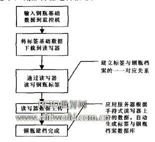 RFID標簽ID號與鋼瓶的唯一編號相對應,采用可讀寫標簽以記錄鋼瓶的基本信息(以在用鋼瓶普查登記表 為例,包括鋼瓶檢驗、充裝、發放相關信息,如下次檢驗時間、充裝時間、發放時間、發放地址等)。通過讀寫器(手持式或固定器)對鋼瓶標簽信息進行識別和數據寫入,進而與監控機、數據中心和應用服務器進行信息交互。