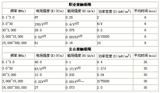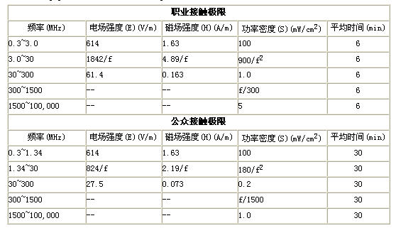 表1~表4給出了目前國內與國外標準規定的限值情況。當然,這些限值是在大量的研究工作的基礎上給出的。考慮到不同的人體對電磁輻射的敏感性方面會存在差異,實際應用中,不同的限值標準也體現出了限值本身含有相當的裕量。