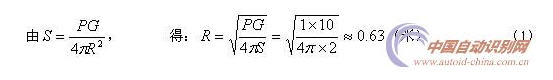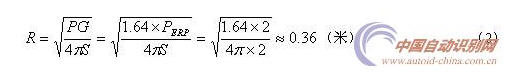 如果考慮到國內信產部發布的“800/900MHz頻段射頻識別(RFID)應用試行規定”的有效輻射功率限制為PERP=2W,重新計算的安全距離為0.36米(如果按美國RFID應用規定的輻射功率PEIRP=PG=4W計算,得到的結果為0.18米),如下式(2)。