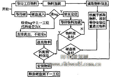 在典型的流程型裝配制造業中(如汽車組裝、發動機裝配、硬盤裝配等)。由于生產安排需要,裝配線上每天都要經常更換產品型號,而每種產品所搭配的零件物料均有所有不同,因此物流管理上帶來問題很多。如硬盤裝配生產中,一旦物料搭配出錯(如磁碟型號)。可能導致成批的不合格產品在流到客戶手中,因此帶來的損失和影響都是巨大的。基于上述要求。我們在裝配生產線上弓I進RFID技術,由于RFID的可讀寫特性,其可提供不斷更新的實時數據以硬盤組裝線為例,生產線裝配工藝簡圖如下: