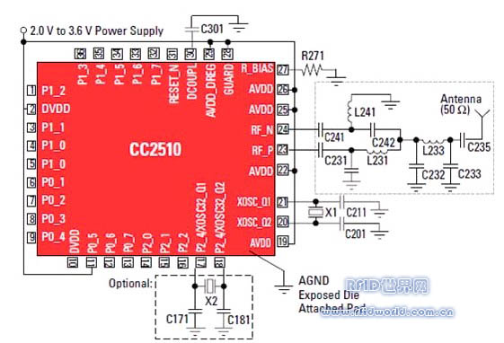 簡單而言,最基本的無線網絡是由無線節點和網關(也稱AP)通過無線電波互聯組成,而無線網關和節點的最基本組成單元是單片機加上無線收發芯片組成,隨著技術進步,單片機和無線收發芯片被集成到一個芯片中,這個芯片簡稱為無線片上系統(SoC),我們也簡稱為無線單片機。DIYRF-2510中,使用的是美國TI公司生產的CC2510無線單片機,該單片機由一個高性能的8051微控制器和一個2.4GHZ的無線收發器集成組成,功能強大,價格低廉,芯片原理見圖2所示。