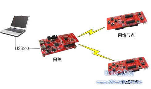 DIYRF-2510構架的低功耗無線網絡結構圖如圖4所示。一根USB電纜,連接網關節點到PC機,將網關通過無線網絡獲得的信息或者PC發出的命令,通過無線網絡傳輸到節點。