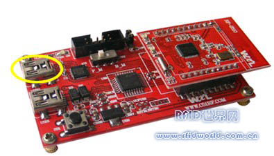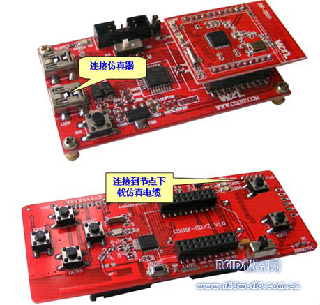 3、根據需要將仿真器分別連接無線節點板,進行下載和調試,首先進行第一號節點,作為AP使用。