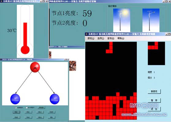 然后你對照說明書,改變PC屏幕上的實驗功能和無線節點上的DIP開關,確定進行下面豐富多彩的各種實驗,包括無線門鈴,無線溫度計,無線遙控器,無線紅綠燈,無線節能路燈控制,無線游戲搖桿等,如圖10所示: