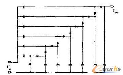 本論文采用肖特基二極管組成的Dickson電荷泵作為整流器電路,其電路原理圖如圖3所示。這是因為肖特基二極管具有較低的串聯電阻和結電容,在將接收到的射頻輸入信號能量轉換為直流電源供電時可以提供較高的轉換效率,從而降低功耗。全部肖特基二極管均通過poly-poly電容連接在一起,其中縱向電容在輸入電壓Vin的負半周期進行充電、儲能,而橫向電容在Vin的正半周期進行充電、儲能,從而產生直流高電壓,其產生的電壓為: