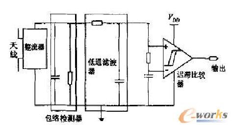 AM解調器電路用于將接收到的調制載波還原成數字信號供基帶處理,解調電路由包絡檢測電路、濾波電路和比較器三部分構成(如圖7所示),其中比較器采用遲滯比較器來降低誤碼率。包絡檢測器采用與整流器相同的電路來提取包絡信號。低通濾波器則用來消除噪聲信號以及電源上的紋波。最后,通過遲滯比較器將包絡信號在比較器的輸出端恢復為數字信號。